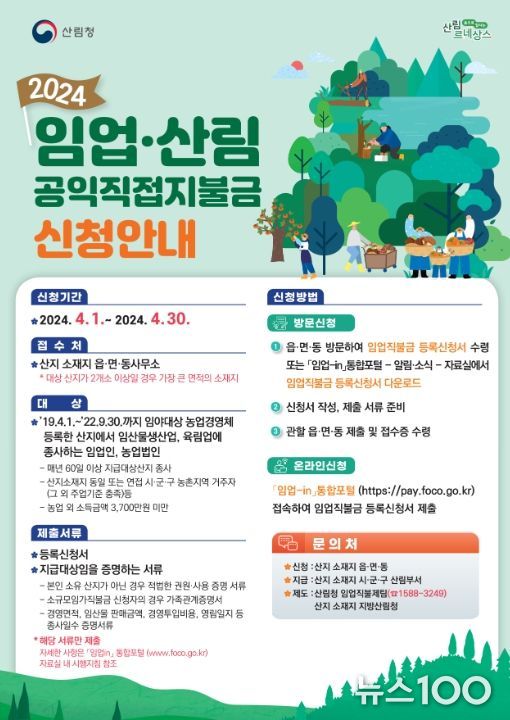 뉴스100 김동초 기자 | 남부지방산림청(청장 최영태)은 2024년 임업·산림 공익직접지불금 신청·접수를 4월 1일부터 4월 30일까지 진행한다고 밝혔다.
