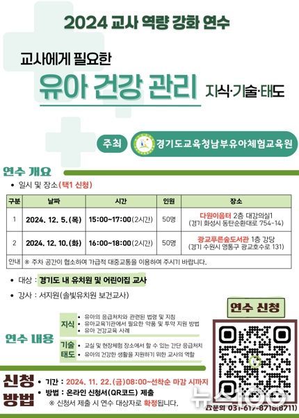 진영란 경기도교육청남부유아체험교육원장은 “유아의 건강과 안전을 관리에 중요한 역할을 하는 유아 교사가 이번 연수로 전문성을 강화하길 바란다”며 “앞으로도 유아교육의 질을 높이고 현장에 실질적으로 도움이 되는 연수를 운영하도록 노력하겠다”고 말했다.
