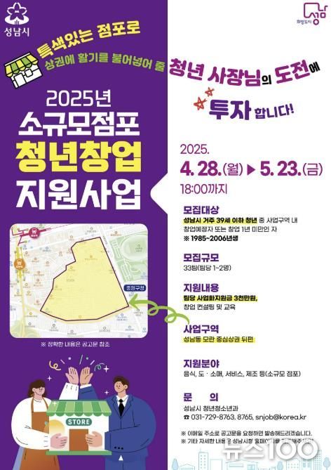 뉴스100 김동초 기자 | 성남시는 소규모 점포를 창업하는 청년 33개 팀(팀당 1~2명)에 사업화 자금 3000만원과 컨설팅을 지원하는 사업을 편다고 1일 밝혔다.