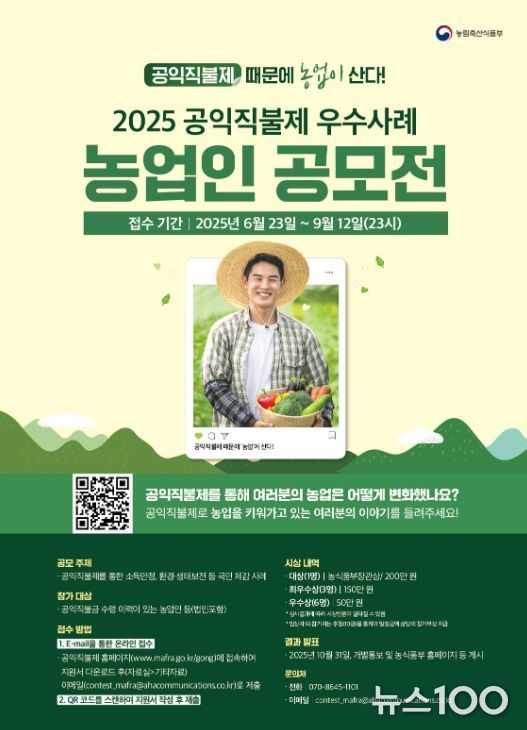 신청 기간은 6월 23일부터 9월 12일 23시까지이며, 공모전 홍보 포스터의 QR 코드로 접속해 네이버폼으로 간편하게 제출하거나, 농식품부 공익직불제 홈페이지에서 신청 서식을 내려받아 이메일로 신청할 수도 있다.