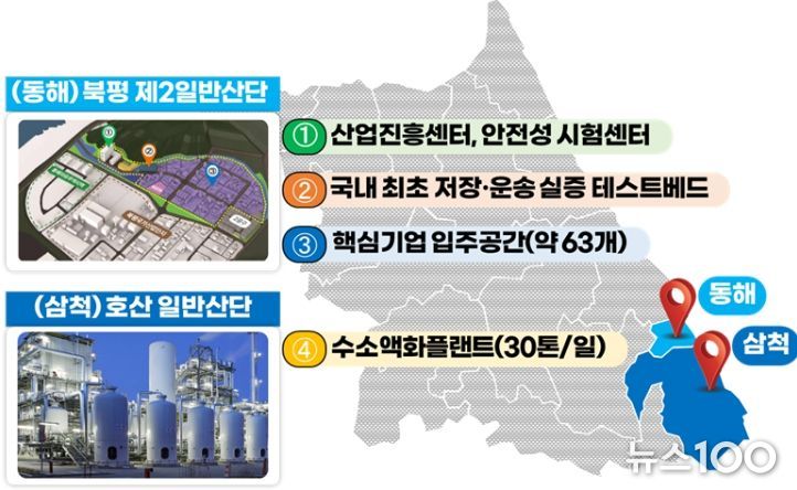 동해·삼척 액화수소 저장·운송 특화단지는 동해에 구축 예정인 산업진흥센터, 소재·부품 안전성시험센터 등의 건축 부지를 올해 4월 매입했으며, 하반기 건축 설계 용역을 통해 내년 3월 착공할 계획이다. 삼척에 구축 예정인 수소액화플랜트에 대해서는 경제성 분석 용역 완료 후 그 결과를 바탕으로 민간 특수목적회사(SPC) 구성을 위한 기업 간 협의를 이어나갈 예정이다.