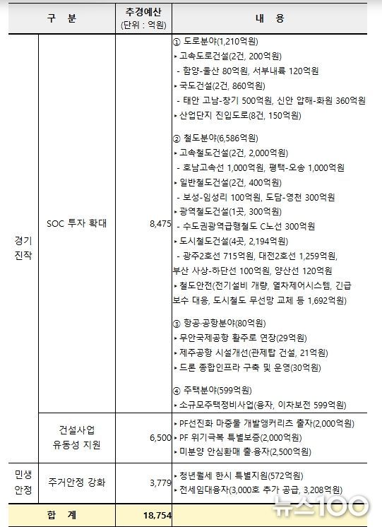 이번 추경예산에는 신규 건설투자 감소 및 유동성 부족으로 어려움을 겪고 있는 건설업계의 활력을 돋우고, 서민의 주거비를 경감하기 위해 필요한 국토부 소관 1조 8,754억원의 신규 세출예산이 반영됐다.