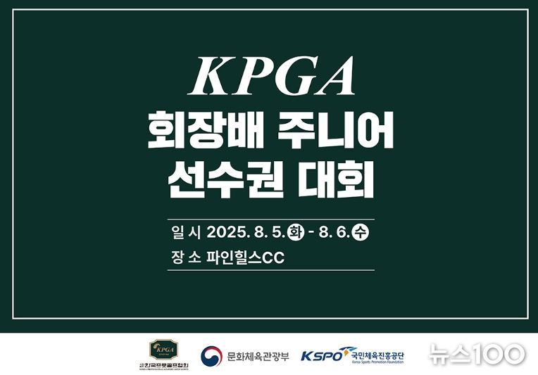 뉴스100 김동초 기자 | (사)한국프로골프협회(회장 김원섭, 이하 KPGA)가 주최 및 주관하고 문화체육관광부와 서울올림픽기념국민체육진흥공단이 후원하는 ‘KPGA 회장배 주니어 선수권대회’가 5일부터 6일까지 양일간 전남 순천 소재 파인힐스 골프&호텔(파72. 6,811야드)에서 개막한다.