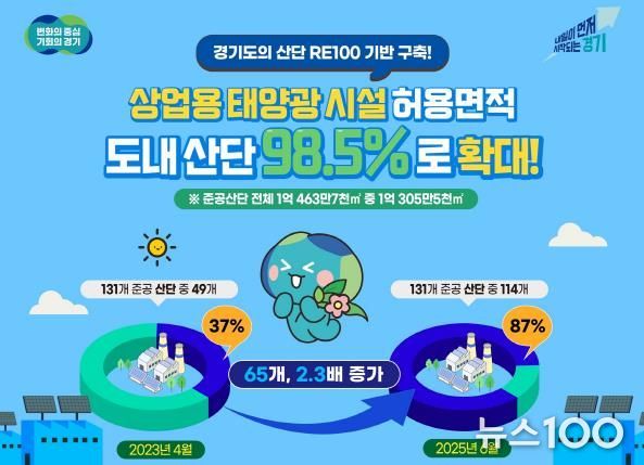 뉴스100 김동초 기자 | 경기도가 산업단지 내 상업용 태양광 재생에너지 시설 설치 허용 면적을 도내 산단의 98.5%까지 확대했다. 2023년 4월 김동연 경기도지사가 ‘경기 RE100’ 비전을 선포한 이후 2년 만에 시군과의 적극적 협력으로 제도적 기반 마련에 성공한 것이다.