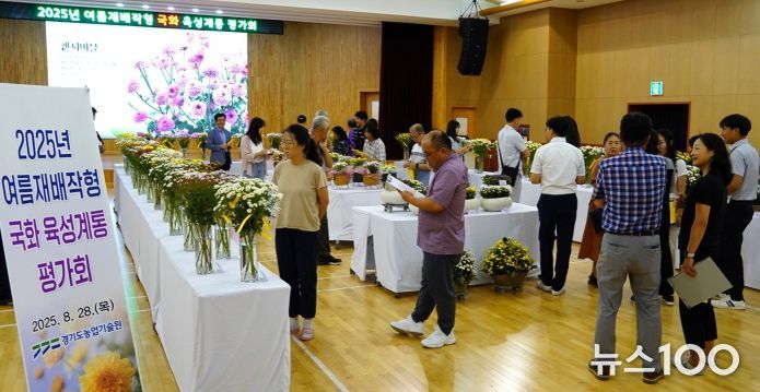 뉴스100 김동초 기자 | 경기도농업기술원은 28일 농업과학교육관에서 여름철 고온 환경에서도 안정적으로 생육·개화하는 국화 신품종 선발을 위한 평가회를 개최했다.