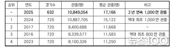 뉴스100 김동초 기자 | KBO 리그가 단일 시즌 역대 최다 관중 신기록 수립을 눈앞에 두고 있다. 9월 4일(목)까지 KBO 리그는 632경기만에 1,084만 9,054명의 관중이 야구장을 찾아 기존 단일 시즌 최다 관중 기록이었던 2024시즌의 1,088만 7,705명에 3만 8,651명을 남겨 뒀다. 출범 첫 시즌이었던 1982년 총 143만 8,768명의 관중으로 시작했던 KBO 리그는 마흔 네번째 시즌 만에 2년 연속 1,000만 관중을 넘어서는 프로스포츠 리그로 성장했다.