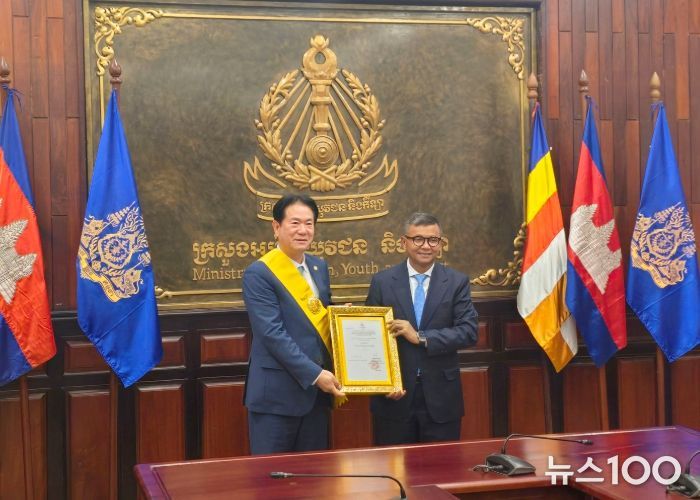 뉴스100 김동초 기자 | 이동섭 국기원장이 캄보디아 국왕으로부터 훈장을 수훈했다.