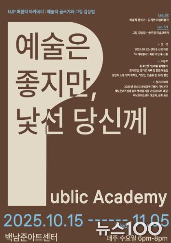 뉴스100 기자 | 경기문화재단 백남준아트센터가 오는 10월 15일부터 11월 5일까지 매주 수요일 저녁, 성인 대상 프로그램 ‘NJP+ 퍼블릭 아카데미: 예술적 글쓰기와 그림 감상법’을 운영한다. 이번 아카데미는 예술은 좋지만 다소 낯설게 느껴졌던 성인들에게, 작품과 친밀하게 소통하고 자기만의 언어로 표현하는 방법을 제시하는 실습과 강의가 접목된 과정이다.