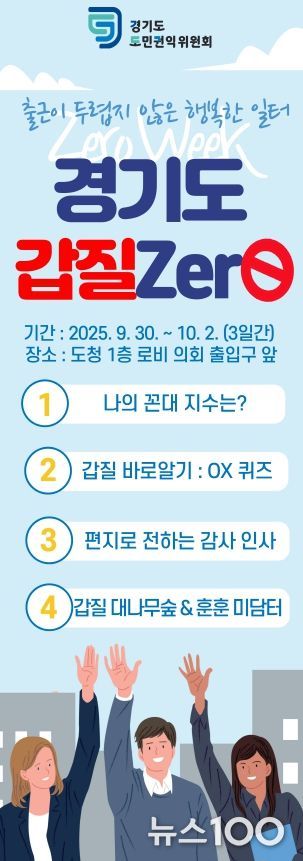 뉴스100 김동초 기자 | 경기도 도민권익위원회는 9월 29일부터 10월 2일까지 ‘경기도 갑질 제로(Zero) 홍보주간’을 지정해 갑질 근절과 건강한 직장문화 조성을 위한 다양한 캠페인과 교육 프로그램을 추진한다.