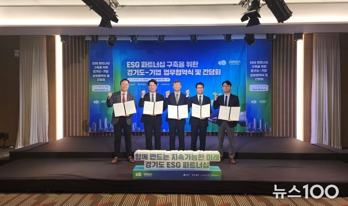 경기도는 29일 코트야드 메리어트 수원에서 하나은행, LGU+, 코스맥스, 시몬스 등 4개 기업 임직원 등이 참석한 가운데 ESG 파트너십 구축을 위한 업무 협약을 체결했다.