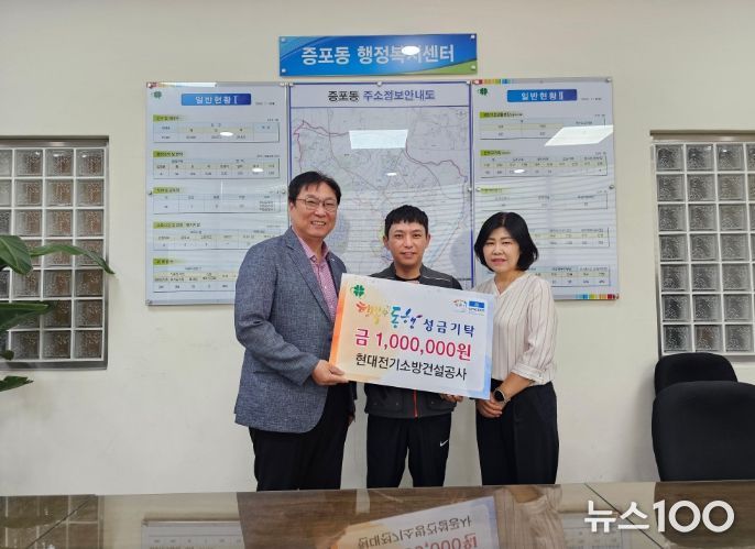 뉴스100 김동초 기자 | 이천시 증포동은 9월 29일, 추석 명절을 앞두고 이천시에 있는 현대전기소방건설공사가 ‘행복한 동행’ 성금 100만 원을 기탁했다고 밝혔다.