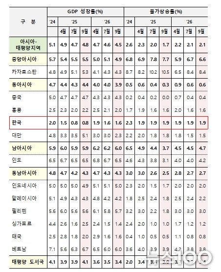 한편, 아시아개발은행은 한국의 ’25년 성장률에 대해서는 7월에 발표한 전망치인 0.8%를 유지했다. 7월 전망은 건설투자 감소, 수출 둔화, 부동산시장 약세 등을 반영하여 4월 전망에 비해 0.7%p 하향 조정된 바 있다. 아시아개발은행은 건설경기 부진, 미국의 관세 인상 및 관련 불확실성 등이 지속되면서 7월 전망치를 유지했으나, 정부의 확장적 재정정책과 완화된 통화정책은 하반기 내수 회복에 기여할 것이라고 평가했다. 아울러 ’26년 경제성장률도 7월과 동일한 1.6%로 전망했다.