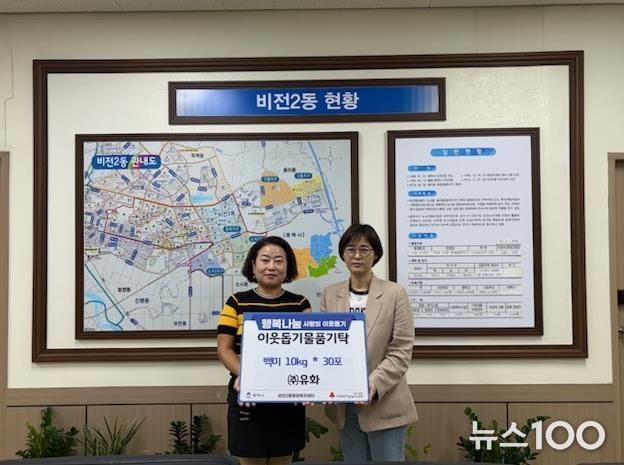 뉴스100 김동초 기자 | ㈜유화는 추석 명절을 맞아 지난 29일 비전2동 행정복지센터를 방문하여 100만원 상당의 백미 30포를 전달하며 온정을 베풀었다.