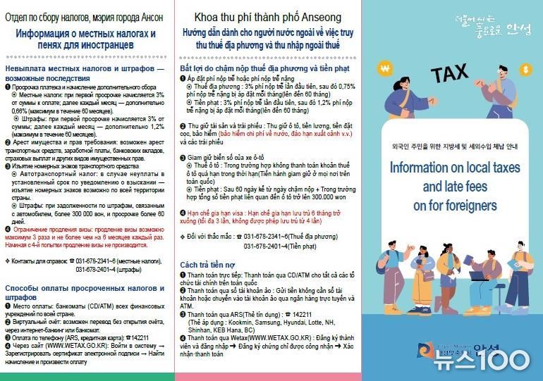 이에 따라 외국인 맞춤형 납세 홍보 수단으로 기존의 영어·중국어·베트남어 3개국 언어로 제작한 체납 안내 리플렛에 러시아어를 추가하여 4개국 언어로 새롭게 제작했고, 포스터, 안내 전단지 등과 함께 외국인 관련 시설 및 단체와 읍·면·동사무소에 비치한다. 외국인이 많이 거주하는 지역에 대한 집중 홍보를 통해 납부 방법과 체납에 따른 불이익을 안내하여 자진납부할 수 있도록 유도할 계획이다.