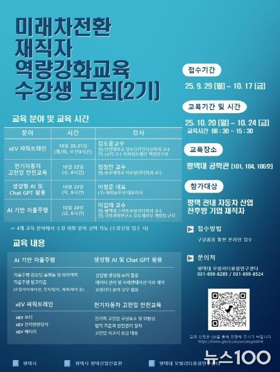 뉴스100 김동초 기자 | 평택시와 평택산업진흥원이 ‘미래차 전환 재직자 역량 강화교육’ 2기 과정을 개설한다. 교육은 10월 20일부터 24일까지 교육 운영기관인 평택대학교에서 진행되며, 지역 자동차 산업 재직자를 대상으로 미래차 핵심 분야 전문지식을 제공한다.