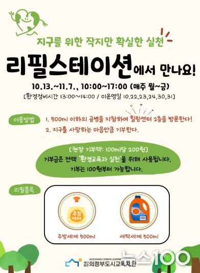 뉴스100 김동초 기자 | (재)의정부도시교육재단은 10월 13일부터 11월 7일까지 매주 월요일부터 금요일, 오전 10시부터 오후 5시까지 힐링센터 2층에서 생활 속 친환경 실천 활동 ‘리필스테이션’을 운영한다.