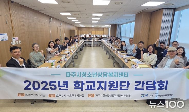 뉴스100 김동초 기자 | (재)파주시청소년재단 파주시청소년상담복지센터(센터장 장문희)는 9월 30일 오후 3시, 센터 내 백리향에서 관내 초·중·고 33개교 교장을 대상으로 '2025년 청소년안전망 학교지원단 간담회'를 개최했다.