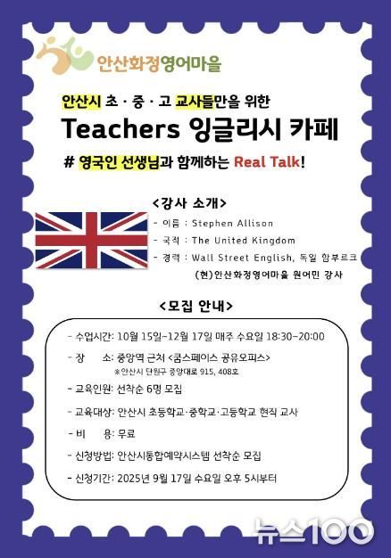 뉴스100 김동초 기자 | 안산시 안산화정영어마을은 오는 15일부터 12월 17일까지 관내 소속 교사를 대상으로 ‘티처스(Teachers) 잉글리시 카페’를 운영한다고 10일 밝혔다.