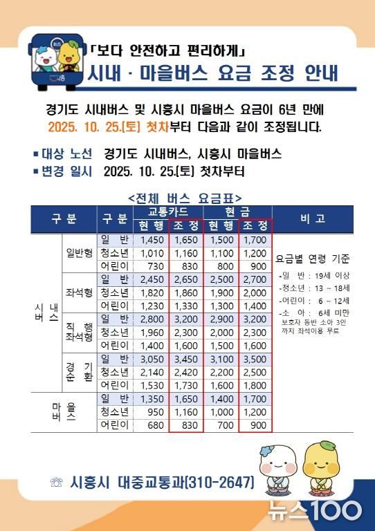 뉴스100 김동초 기자 | 시흥시는 오는 10월 25일 첫차부터 경기도 시내버스 및 시흥시 마을버스 요금을 조정한다.