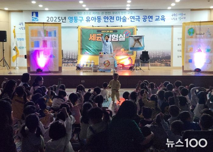 뉴스100 김동초 기자 | 수원시 영통구는 2025. 10. 13. 영통구청 대회의실에서 관내 유아를 대상으로 안전한 위생 습관을 형성하기 위한 ‘찰리박사의 세균실험실’ 체험형 안전마술·연극 공연 교육을 실시했다.