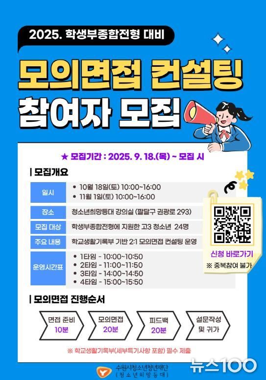 뉴스100 김동초 기자 | 수원시청소년청년재단 청소년희망등대는 2026학년도 대학입시를 준비하는 청소년들을 대상으로 ‘학생부종합전형 모의면접 컨설팅’ 프로그램을 운영하며, 9월 18일부터 참가자를 모집중이다.