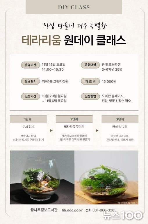 뉴스100 김동초 기자 | 동두천시 도서문화사업소 꿈나무정보도서관은 오는 10월 20일부터 초등학교 3~6학년을 대상으로 『테라리움 만들기』 원데이 클래스를 운영한다고 밝혔다.
