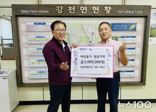 뉴스100 김동초 기자 | 성일우레탄㈜ 이민우 대표가 지난 15일 강천면 행정복지센터를 방문하여 관내 소외계층 복지사업을 위한 성금 300만원을 강천면에 기탁했다.