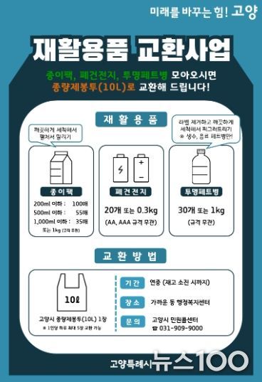 뉴스100 김동초 기자 | 고양특례시가 2회 추가경정예산을 통해 2천만 원을 확보해 시민들의 호응 속에 추진 중인 재활용품 교환사업을 계속 이어간다.