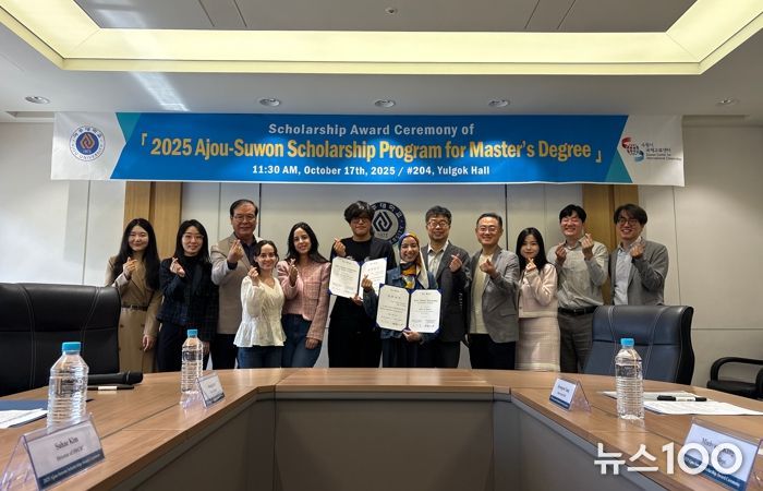 뉴스100 김동초 기자 | 수원시국제교류센터가 17일 아주대학교 율곡관 제1회의실에서 ‘2025 아주-수원 석사과정 장학증서 수여식’을 열고, 자매·우호도시 출신 유학생들에게 장학증서를 전달했다.