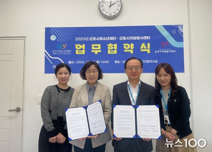뉴스100 김동초 기자 | 군포시청소년재단은 10월 20일 군포시청소년재단 대표이사실에서 군포시자원봉사센터와 지역사회 상생 및 자원봉사 활성화를 위한 업무협약을 체결했다.