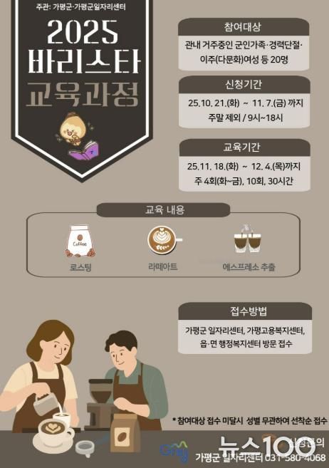 뉴스100 김동초 기자 | 가평군은 군인가족, 경력단절여성, 다문화여성 등 취업취약계층 여성을 대상으로 ‘바리스타 2급 자격증 취득과정’을 운영하며, 총 20명의 교육생을 모집한다.