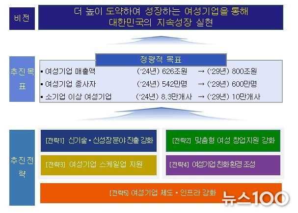 뉴스100 김동초 기자 | 중소벤처기업부 는 22일 여성의 창업부터 성장, 글로벌 진출까지 전 주기를 체계적으로 지원하기 위한'제2차 여성기업 활동 촉진 기본계획(’25~’29)'(기본계획)을 발표했다.