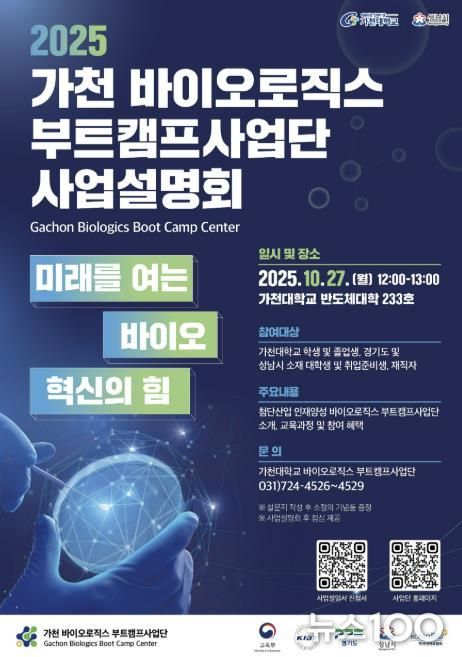 뉴스100 김동초 기자 | 성남시는 오는 10월 27일 낮 12시부터 1시까지 가천대학교 반도체대학 233호에서 ‘2025 가천 바이오로직스 부트캠프 사업단 설명회’를 연다.