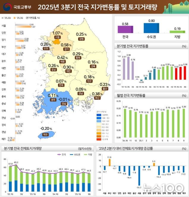 뉴스100 김동초 기자 | 국토교통부와 한국부동산원(원장 손태락)은 '25년 3분기 지가변동률 및 토지거래량을 발표했다.