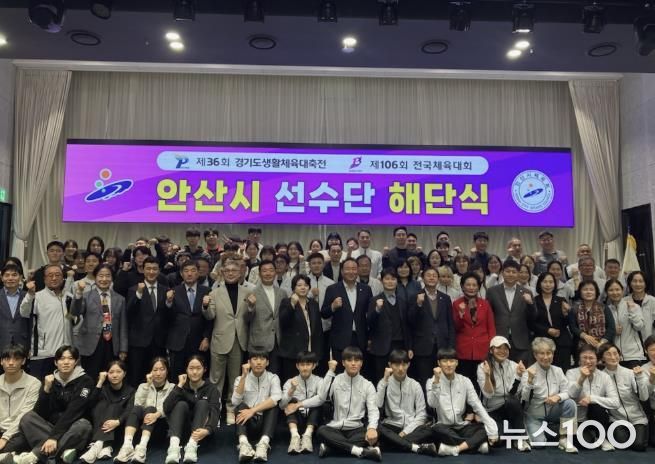 뉴스100 김동초 기자 | 안산시는 지난 29일 안산상공회의소 그레이트컨벤션에서 ‘제36회 경기도생활체육대축전 및 제106회 전국체육대회 안산시 선수단 해단식’을 개최하고 안산시를 빛낸 선수단의 노고를 격려하는 자리를 마련했다고 30일 밝혔다.