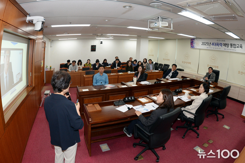 오산시의회(의장 이상복)는 14일 의회 제2회의실에서 의원과 의회사무과 직원을 대상으로 ‘4대 폭력(성희롱·성매매·성폭력·가정폭력) 통합 예방교육’을 실시했다.