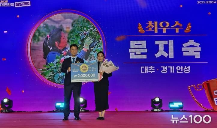 뉴스100 김동초 기자 | 농림축산식품부 주최, 한국과수농협연합회 주관으로 하는 ‘2025 대한민국 과일산업대전 대표과일선발대회’에서 안성시가 2023년부터 대추부문에서 최우수상, 우수상을 수상하여 3년 연속 대추부문 최고자리에 올랐다. 수상자로 문지숙 대표가 최우수상(농림축산식품부장관상)으로 선정됐고, 조재곤 대표가 우수상(산림청장상)으로 선정됐다.