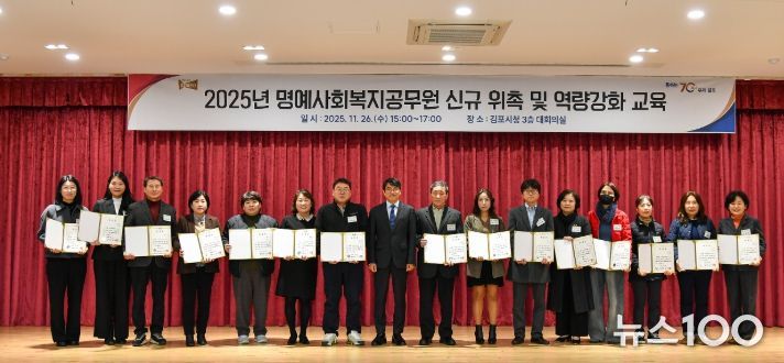 뉴스100 김동초 기자 | 김포시는 지난 26일 통·리장과 지역사회보장협의체 위원 등 지역 주민 181명을 신규 명예사회복지공무원으로 위촉했다. 이 중 대표 15명에게 위촉장을 수여했으며, 약 100명을 대상으로 역량 강화 교육도 함께 진행했다.