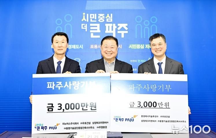 뉴스100 김동초 기자 | 파주시는 지난 27일, 소각장 및 공공폐수처리시설 운영사가 지역 취약계층 지원을 위해 총 6,000만 원의 성금을 기탁했다고 밝혔다. 이번 기부는 공동도급 참여사들도 함께 뜻을 모으며 의미를 더했다.