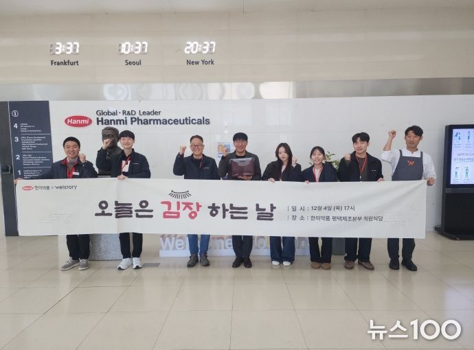 뉴스100 김동초 기자 | 평택시 팽성읍 추팔산업단지에 있는 ‘한미약품 평택제조본부’에서 올 겨울을 앞두고 지역사회 이웃들과 따뜻한 정을 함께 나누기 위하여, 직원들이 직접 담근 김장 김치 10㎏ 60통을 팽성읍에 기부했다.
