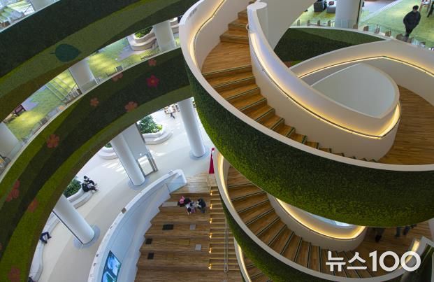 경기도서관은 2025년 10월에 개관한 신생 도서관이다. 지상 5층 건물은 나선형 구조와 창살 문양으로 설계되어 외관부터 남다르다. 문을 열고 들어서면 이곳이 단순히 책을 빌리는 장소가 아니라는 사실을 곧 알게 된다. 칸막이가 없는 동선 설계로 공간 전체가 하나의 거대한 서재 혹은 거실을 연상케 한다. 층과 층을 연결하는 길에는 ‘경기책길’이라는 이름을 붙였다. 벽면이 모두 통창이고 곳곳에 작은 정원을 꾸며놓아서 마치 숲에서 책을 읽는 느낌이 들기도 한다.