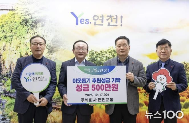 뉴스100 김동초 기자 | 연천군 신서면에 소재한 ㈜연천교통은 지난 17일 연천군청을 방문해 관내 소외계층을 돕기 위한 후원성금 500만원을 기탁했다.