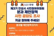 뉴스100 김동초 기자 | 안성시는 오는 18일 오후 6시까지 시민참여위원회 분과별 제안 정책에 대한 시민 의견을 수렴한다고 밝혔다. 이번 시민 의견 수렴은 시민참여위원회 정책 발표회를 앞두고 진행하는 사전심사로, 분과별 제안 정책에 대한 시민 공감도를 확인하여 추후 현장심사 결과와 함께 최종 우수 제안 정책을 선정하는 데 활용된다. 7개 분과로 구성된 안성시 시민참여위원회는 소속 위원의 다양한 경험과 지속적인 논의를 바탕으로 안성시 시정에 반영할 정책 연구 활동을 추진해 왔으며, 이달 정책 발표회를 통해 각 분과에서 도출한 정책을 제안하여 그간 활동의 결실을 맺을 예정이다. 정책 발표회를 통해 각 분과에서 제안할 정책 주제는 ▲Safety 안성, 시민이 안전한 도시 만들기(공공혁신분과) ▲안성시 평생학습도시에 따른 평생교육 강사 플랫폼 구축(교육특화분과) ▲안성시 한우산업 탄소중립 모니터링 시스템 구축(미래농업분과) ▲안성시민을 위한 태양광발전 5개년 계획(생태도시분과) ▲전통문화 예술인들을 위한 창작공간 확보(문화도시분과) ▲안성, 사랑 흔들바위 관광지 조성(문화도시분과) ▲더불어 이동하는 자유로운 안성(생