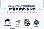 뉴스100 기자 | 경기문화재단 경기상상캠퍼스(대표이사 유정주)는 겨울 시즌 생활창작공방 프로그램 참여자를 오는 17일부터 모집한다. 생활창작공방은 경기상상캠퍼스 생생1990에 위치한 경기생활문화센터 교육 커뮤니티 공간으로, 도민이 일상 속에서 다양한 창작 활동을 경험할 수 있도록 재단공방, 어린이창작공방, 드로잉실, 취미공방, 직물공방, 커피공방, 사진촬영실까지 총 7개의 특화 공간을 운영하고 있다. 11월에는 총 11개의 프로그램이 구성돼 있으며, 주요 프로그램으로는 △Set in wool(울조끼와 가방 만들기), △오롯이 나에게 집중하는 시간: 4주 터프팅 힐링 프로젝트, △내 생애 첫 그림- 알기 쉬운 민화'일월오봉도', △그림책 마음 놀이터 등이 있다. 12월에는 △오일파스텔로 만드는 2026년 달력 △우리들의 예술놀이터, △복을 담는 라탄 복조리 만들기, △복을 쓸어 담는 모시 빗자루 만들기, △커피의 감별과 추출 방법: 커핑까지 총 5개의 프로그램이 운영될 예정이며, 수강 신청은 11월 14일부터 각 프로그램 시작 4일 전까지 경기상상캠퍼스 누리집을 통해 가능하다. 경기상상캠퍼스 내