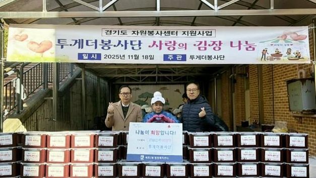 뉴스100 김동초 기자 | 지난 11월 18일 투게더봉사단은 수원시 영통구 매탄4동 행정복지센터에 저소득가정을 위해 직접 김장한 김치 40박스를 기부했다. 투게더봉사단은 매년 명절 이웃사랑 나눔, 사랑의 밥차 봉사 등 매탄4동 주민들을 위한 봉사활동을 꾸준히 이어가는 단체로 이날 이른 아침부터 봉사단원들이 추운 날씨에도 불구하고 정성껏 김치를 담가 따뜻한 마음을 전달했다. 최상학 투게더봉사단 단장은 “김장철을 맞아 준비한 김치가 어려운 이웃들에게 도움이 됐으면 한다. 앞으로도 지역사회를 위해 꾸준히 봉사하고 나눔을 실천하겠다”고 전했다. 민상희 매탄4동장은 “지역 내 나눔 문화 확산에 앞장서는 투게더봉사단에 깊이 감사드린다. 기부해주신 김치는 도움이 필요한 분들께 소중히 전달하겠다”고 말했다. 매탄4동은 앞으로도 다양한 민간단체와 협력해 복지 사각지대 해소와 이웃사랑 실천에 힘쓸 계획이다. [뉴스출처 : 경기도 수원시]