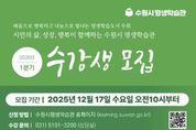 뉴스100 김동초 기자 | 수원시평생학습관이 12월 17일 오전 10시부터 2026년 1분기 수강생을 모집한다. 1월부터 3월까지 운영되는 1분기 강좌는 ▲첨단미래기술 프로그램 ▲디지털 지식정보 프로그램 ▲생활문화 프로그램 ▲교양 프로그램 ▲인문 프로그램 ▲기관 협력 재능기부 프로그램 ▲거북이공방 프로그램 ▲대상별 맞춤프로그램 ▲시민교육 프로그램 ▲언제든학교 시민기획 프로그램 ▲무지한스승의만남 시민참여기획 프로그램 등 총 11개 과정, 115개 세부 강좌로 구성됐다. 첨단미래 기술 프로그램을 강화했다. 인공지능(AI) 기술에 초점을 둔 첨단미래기술 프로그램, 성균관대학교 지능로봇리빙랩과의 협업을 통한 자율주행 실습, 가상현실(VR)드론 시뮬레이션 체험 등이 있다. 또 글쓰기, 사주명리학, 한글 서예, 현대미술, 명화감상, 뮤지컬 등을 주제로 한 교양 프로그램과 중장년, 시니어, 제2의 인생설계, 청소년 등을 대상으로 하는 대상별 맞춤 프로그램을 마련했다. 수원시는 새빛톡톡 시민 설문조사를 활용해 2026년 강사를 공개 모집했고, ▲생활문화 프로그램 ▲디지털 지식정보 프로그램 ▲대상별 맞춤프로그램
