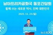 뉴스100 김동초 기자 | 주요 20개국(G20) 정상회의 참석을 위해 남아프리카공화국을 방문한 이재명 대통령은 23일(현지시간) 양국 수교 후 최초로 동포간담회를 개최해 현지에 거주하는 동포들을 격려했다. 이번 간담회에는 동포단체 대표, 경제인, 민주평통 자문위원, 한글학교 관계자, 문화예술인 등 약 70명이 참석했다. 동포 대표로 나선 전소영 남아공 한인회장은 환영사에서 "한국과 남아공은 오랜 세월 우정과 신뢰를 쌓아온 파트너인 만큼, 대통령님의 이번 방문이 양국 관계를 굳건히 다지는 계기가 되기를 기대한다"는 소망을 전했다. 이 대통령은 격려사를 통해 "모국에서 약 1만 2000km인 삼만 리나 떨어진 남아공에서도 동포들이 주권 행사에 어려움이 없도록 전자투표 도입 등 재외선거제도 개선에 노력하겠다"라고 말했다. 또한, "재외동포 현황을 면밀히 파악하고 동포들의 활동을 본국이 적극 지원해 대한민국 국민으로서 소외되지 않고 자부심을 가질 수 있도록 최선을 다하겠다"고 격려했다. 이어 이동민 민주평통자문회의 아프리카협의회 중남부지회장의 건배사로 본격적인 오찬이 시작됐다. 이 대통