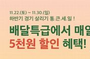 뉴스100 김동초 기자 | 경기도 공공배달앱 배달특급이 2025년 하반기 경기살리기 ‘통 큰 세일’에 합류한다. 경기도주식회사는 오는 30일 일요일까지 배달특급 전체 회원을 대상으로 배달특급 입점 가맹점에서 사용할 수 있는 5천원 할인 쿠폰을 제공한다고 23일 밝혔다. 해당 프로모션은 배달특급 애플리케이션 내 상반 ‘통 큰 세일’ 배너를 통해 쿠폰을 내려받아 결제 단계에서 사용할 수 있다. 예산 소진 시까지 회원당 매일 1회 내려받아 사용 가능하다. 배달특급은 지난 상반기에도 경기도와 경기도시장상권진흥원이 추진한 ‘2025년 상반기 경기 살리기 통 큰 세일’에 참여한 바 있다. 당시 배달특급은 경기도 지역화폐가 연동되는 공공배달앱 3사(배달특급, 땡겨요, 먹깨비) 가운데 가장 먼저 할인 쿠폰을 소진시켰고, 가장 많은 30억 원의 거래액을 기록하며 소비자와 소상공인의 상생을 이끌어 낸 바 있다. 한편, 배달특급의 모든 이벤트는 해당 상단 배너 기능을 통해 확인 가능하며, 지역에 따라 할인 조건과 금액이 달라질 수 있어 사전 확인이 필요하다. [뉴스출처 : 경기도]
