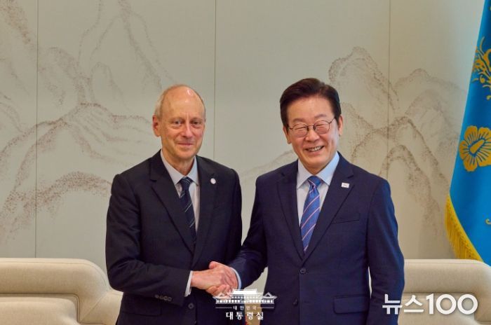 뉴스100 김동초 기자 | 이재명 대통령은 오늘 오후 집무실에서 '정의란 무엇인가'의 저자인 마이클 샌델 미국 하버드대 교수를 접견했다.