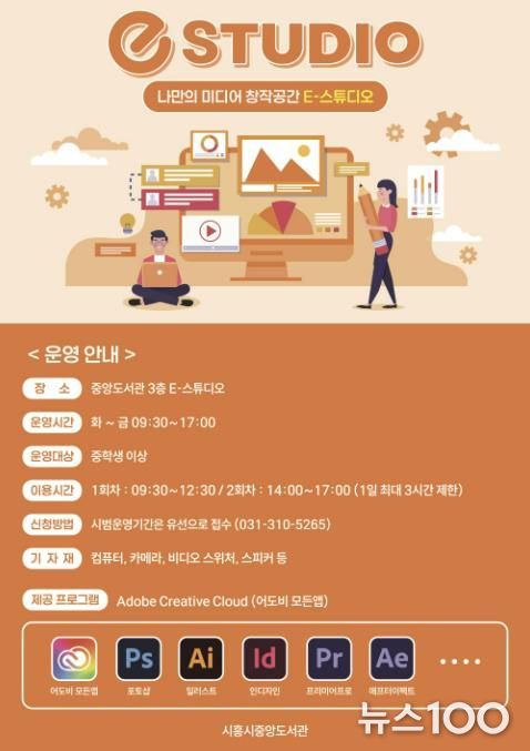뉴스100 김동초 기자 | 시흥시중앙도서관은 시민들의 미디어 창작활동을 적극 지원하기 위해 도서관 3층에 위치한 e-스튜디오에 어도비 크리에이티브 클라우드(Adobe Creative Cloud)를 도입해 오는 9월 25일부터 시범 운영을 시작한다.